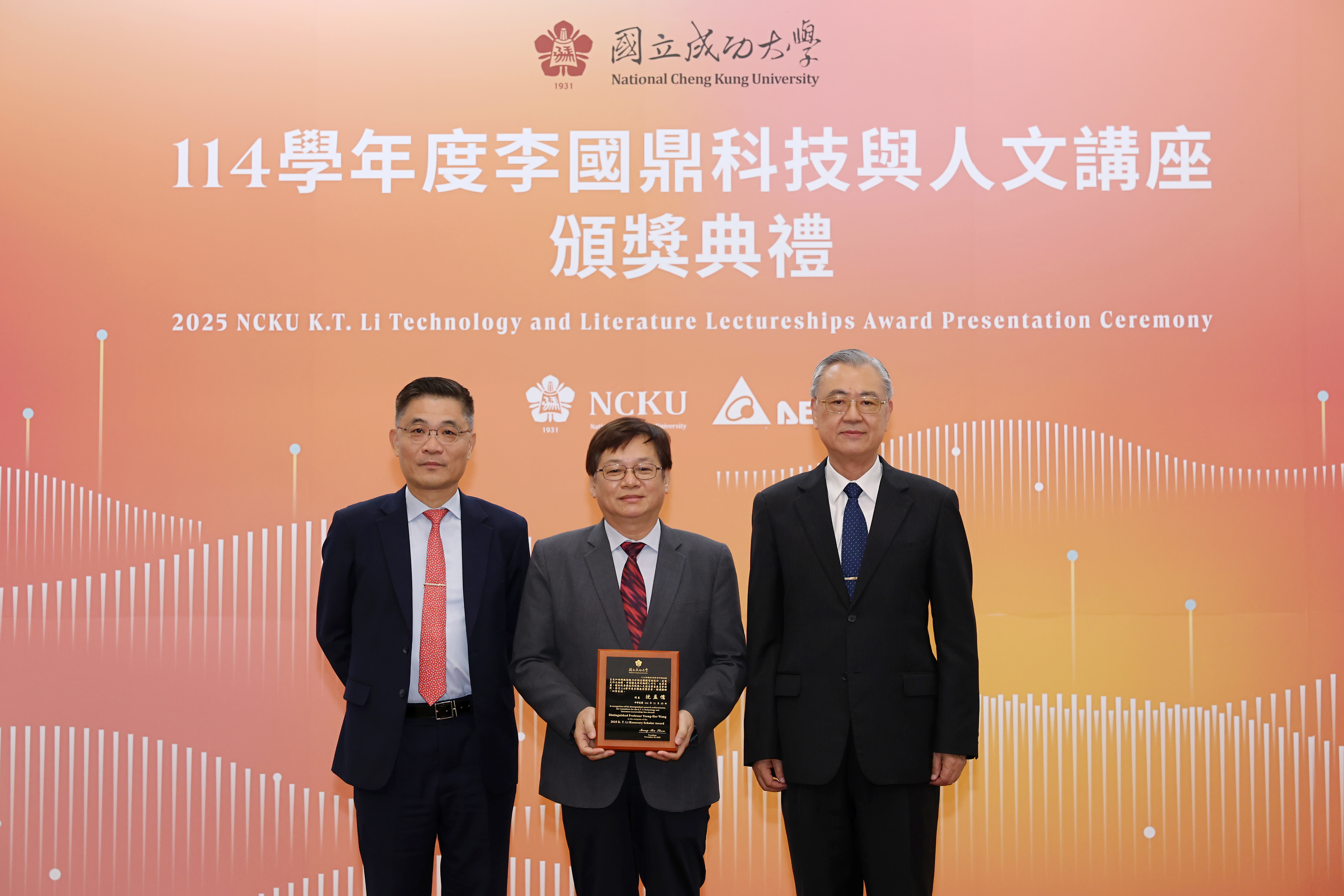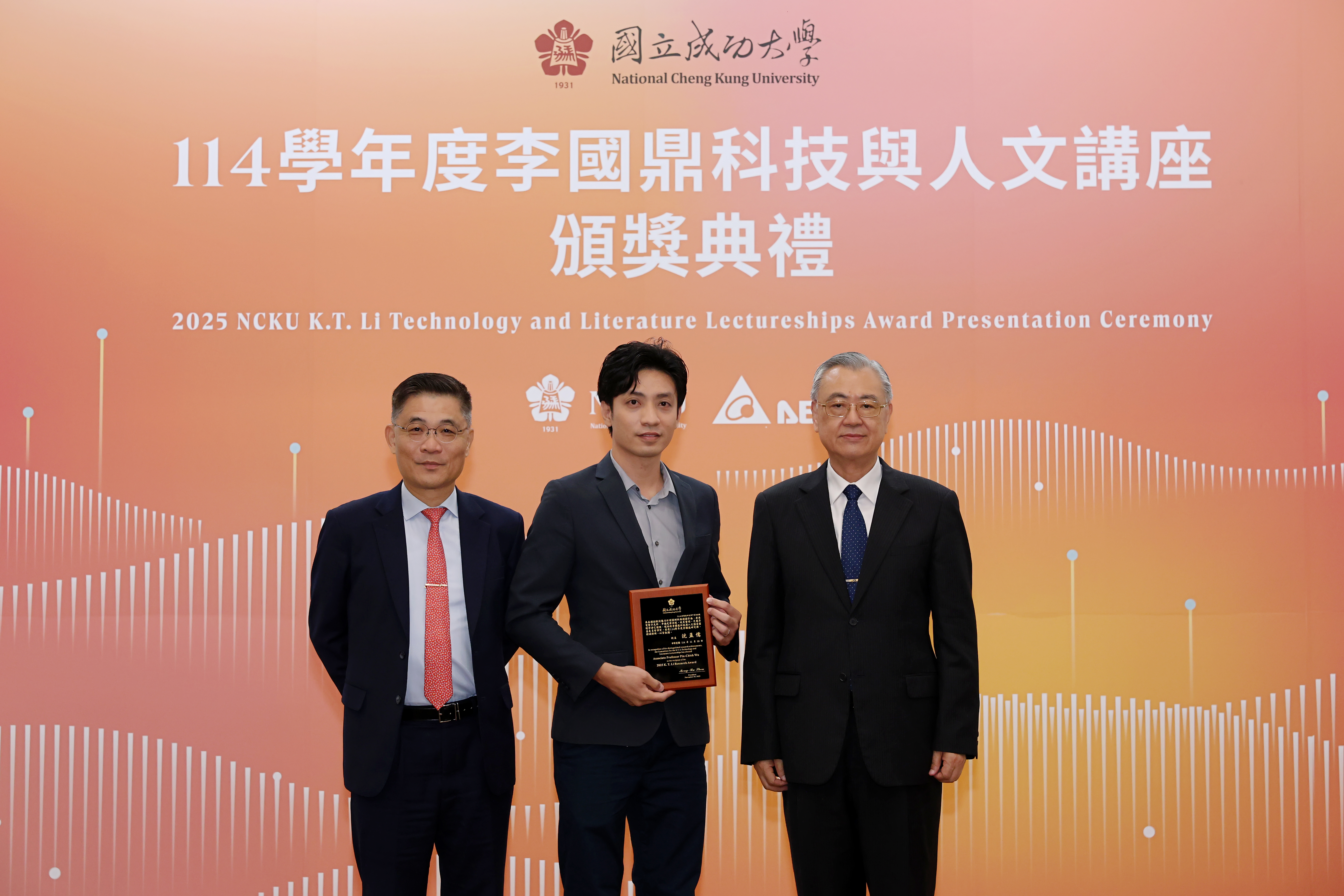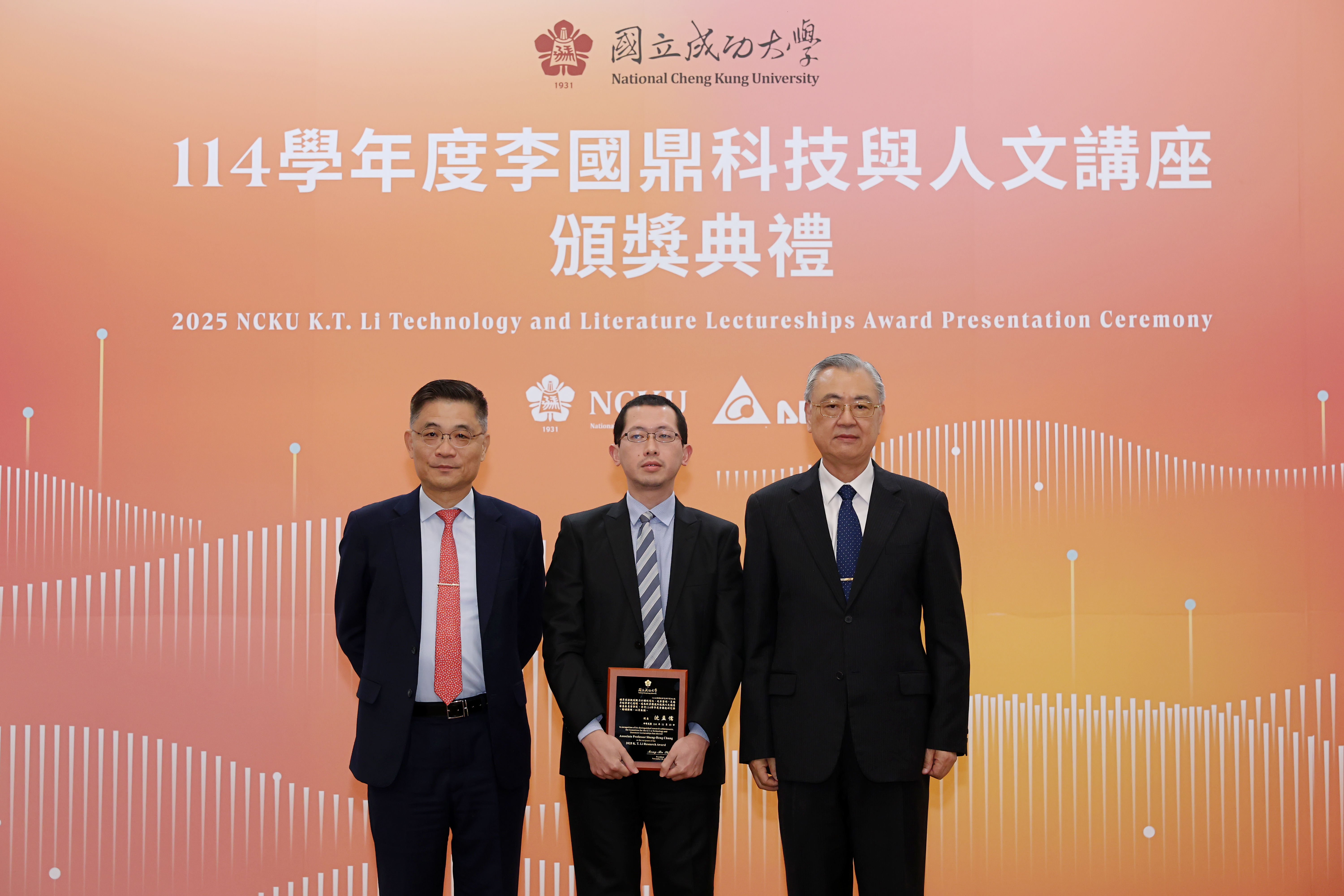 國立成功大學 114 學年度「李國鼎科技與人文講座」今(10)日下午在成大成功校區格致堂舉行頒獎典禮,由成大校長沈孟儒及台達電子資深副總裁金壽豐共同表揚 8 位獲獎學者,分別獲頒「李國鼎榮譽學者」、「李國鼎研究獎」及「李國鼎金質獎」。今年 3 位獲頒「李國鼎榮譽學者」分別為:成大機械系羅裕龍講座教授、電機系王永和特聘教授與材料系林士剛特聘教授。獲頒「李國鼎研究獎」3 位:材料系鍾昇恆副教授、電機系林家祥教授及光電系吳品頡教授。獲頒「李國鼎金質獎」2 位:機械系鍾震桂特聘教授與電機系施權峰教授。