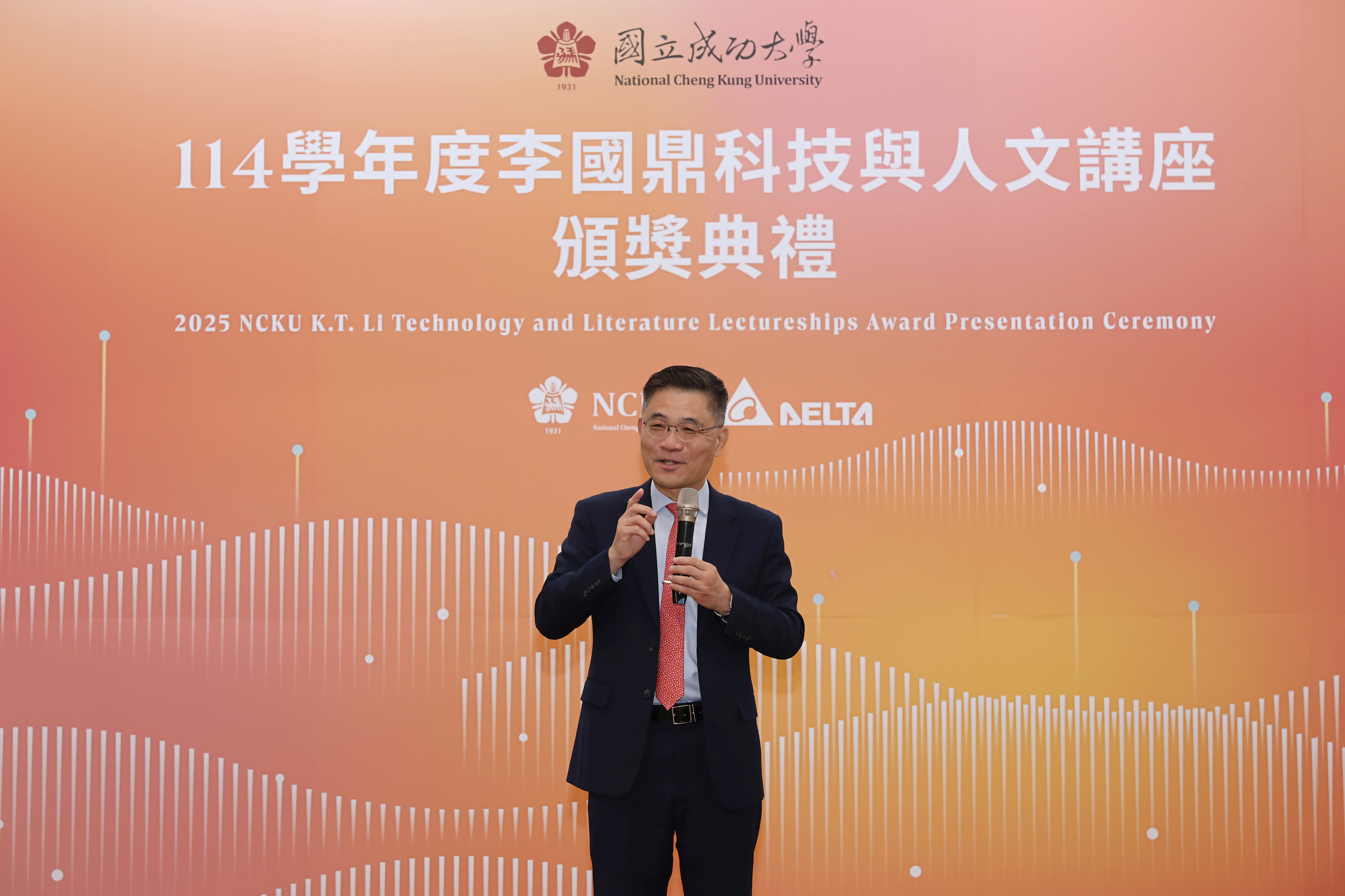 「李國鼎科技與人文講座」由台達電子工業股份有限公司創辦人,同時也是成大傑出校友的鄭崇華先生捐贈設立,今已邁入第 24 年。台達電子資深副總裁金壽豐代表鄭崇華創辦人向所有獲獎學者獻上最誠摯的祝賀之意,所有獲獎學者都是深耕研究領域,得獎乃是實至名歸,也希望各位學者未來繼續在各自領域上百尺竿頭、更進一步,培養自己、造就自己,貢獻學校、社會及國家。